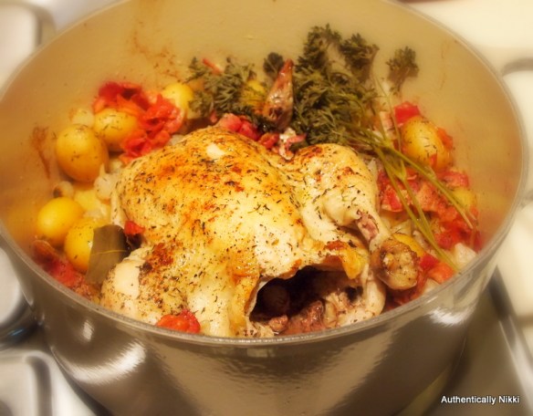 August 15, 2012 would have been Julia’s 100th birthday and in honor of her, I chose to cook this classic one-pot meal from Mastering the Art of French Cooking, Volume 1. Poulet en Cocotte Bonne Femme is the fancy name for this dish which is just a pot-roasted whole chicken with potatoes, onions and bacon. I made this using a large (7-quart) Le Creuset dutch oven which allowed for an easy transition from stove top to oven. If you don’t have an oven safe pot large enough to hold all the ingredients, you can do all the browning in a skillet and transfer the chicken to a large baking dish (either Corningware with a glass lid or a 9-x13-inch baking dish covered tightly with foil). The recipe states that you should brown the chicken for a rather lengthy time, 12-15 minutes per side. Please don’t skimp on this since the chicken will not brown at all in the oven. Chicken Bonne Femme is French cooking at it’s simplest and quite possibly it’s tastiest. Finally, I’ll leave you with a classic quote from Julia…..